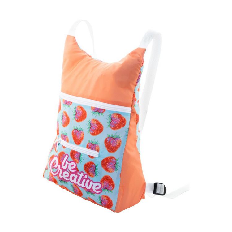 Zaino in RPET ripiegabile in poliestere 190T RPET personalizzabile con grafica stampata in sublimazione su tutta la superficie, scomparto principale e tasca frontale chiusi da cerniera ed etichetta RPET. MOQ: 25 pezzi.