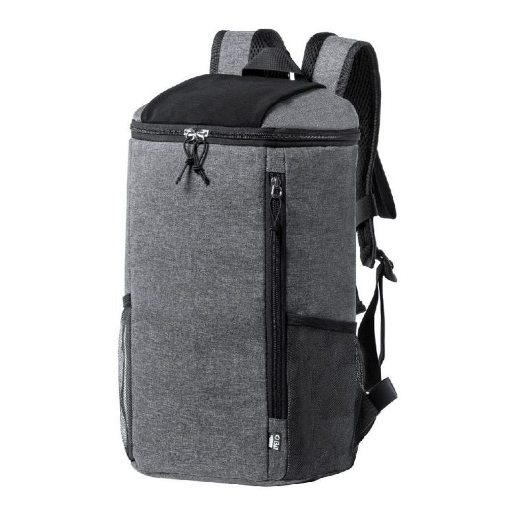Zaino termico in poliestere 600D RPET con cerniera nella tasca principale, imbottitura in PEVA, tasche laterali in rete, spallacci imbottiti ed etichetta RPET, in colore grigio